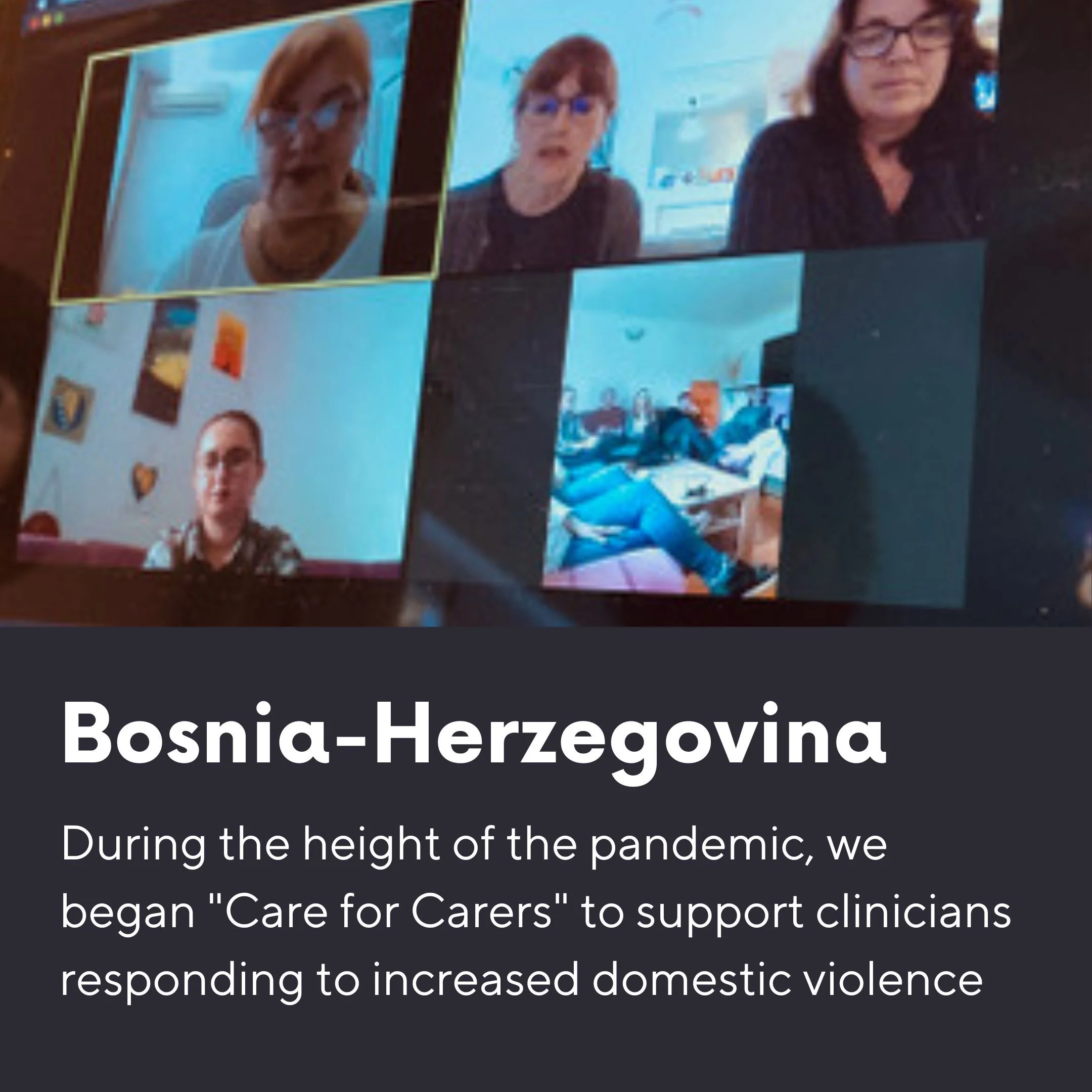 Description: Zoom meeting showing four participant screens, with the text “Bosnia-Herzegovina: During the height of the pandemic, we began ‘Care for Carers’ to support clinicians responding to increased domestic violence”